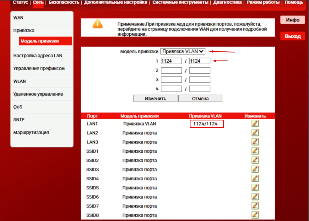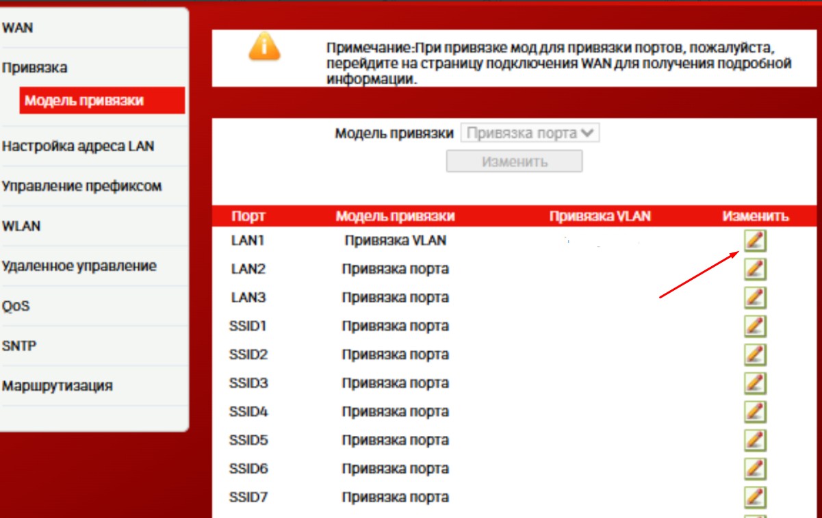 После переходим в «Сеть» → «Привязка» → «Модель привязки» на нужном порту выбираем редактировать