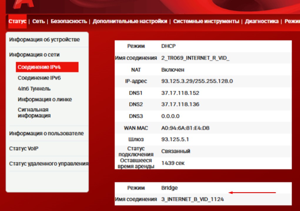 Проверяем создание интерфейса проверяем в разделе «Сеть» → «Информация о сети» → «Соединение IPv4»