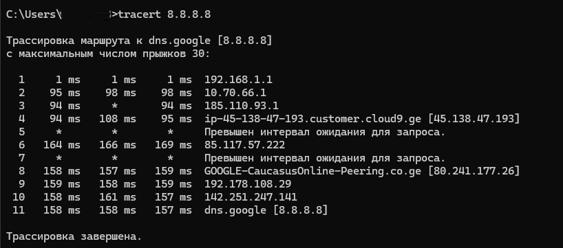 Далее вводим команду tracert X.X.X.X. Нажимаем клавишу Enter.