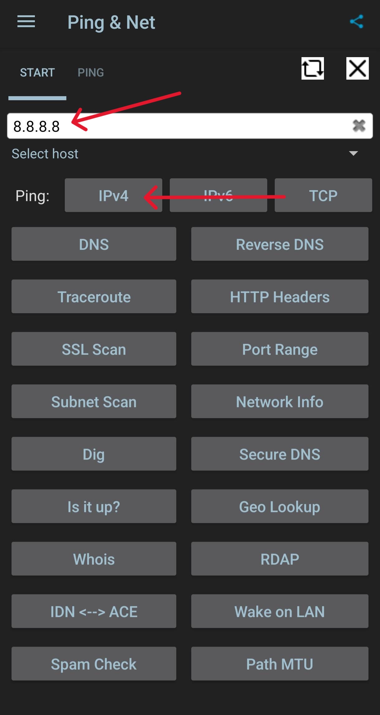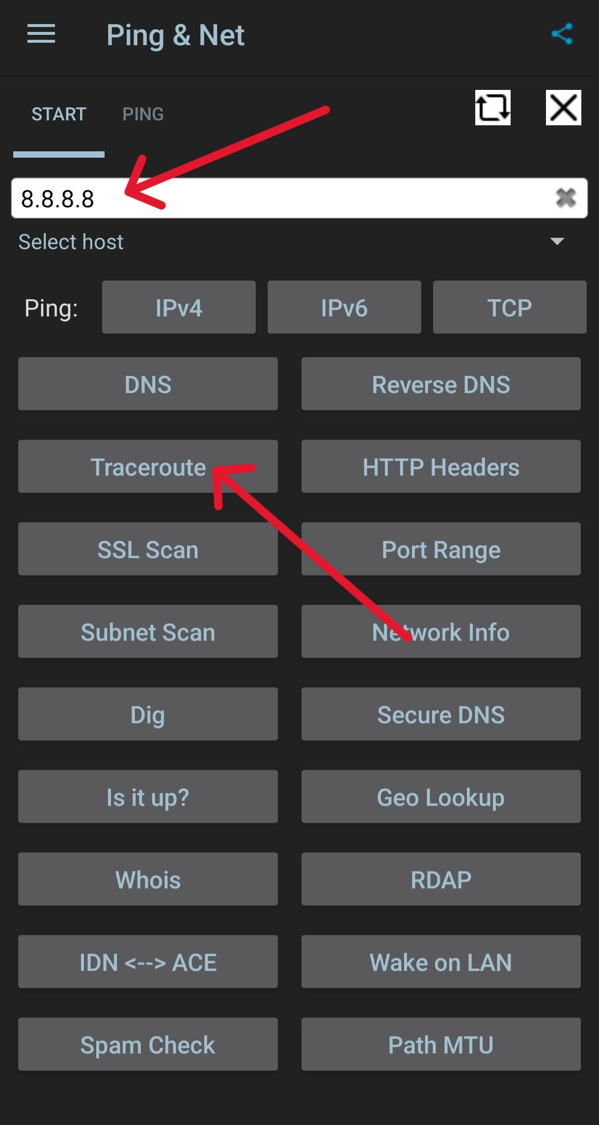 Выберите нужную команду, введите адрес 8.8.8.8, нажмите Start.