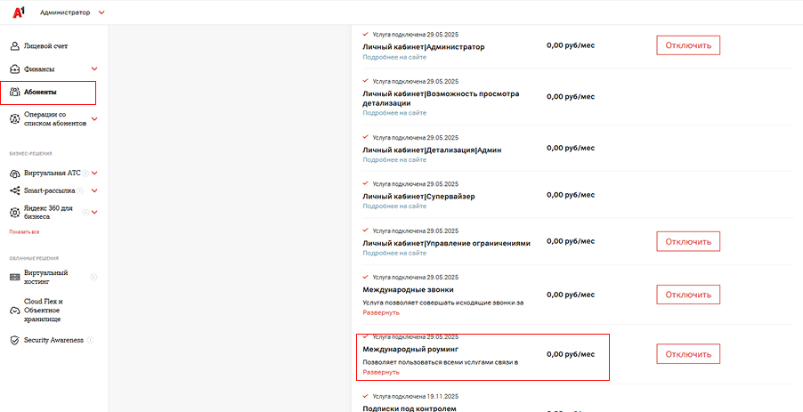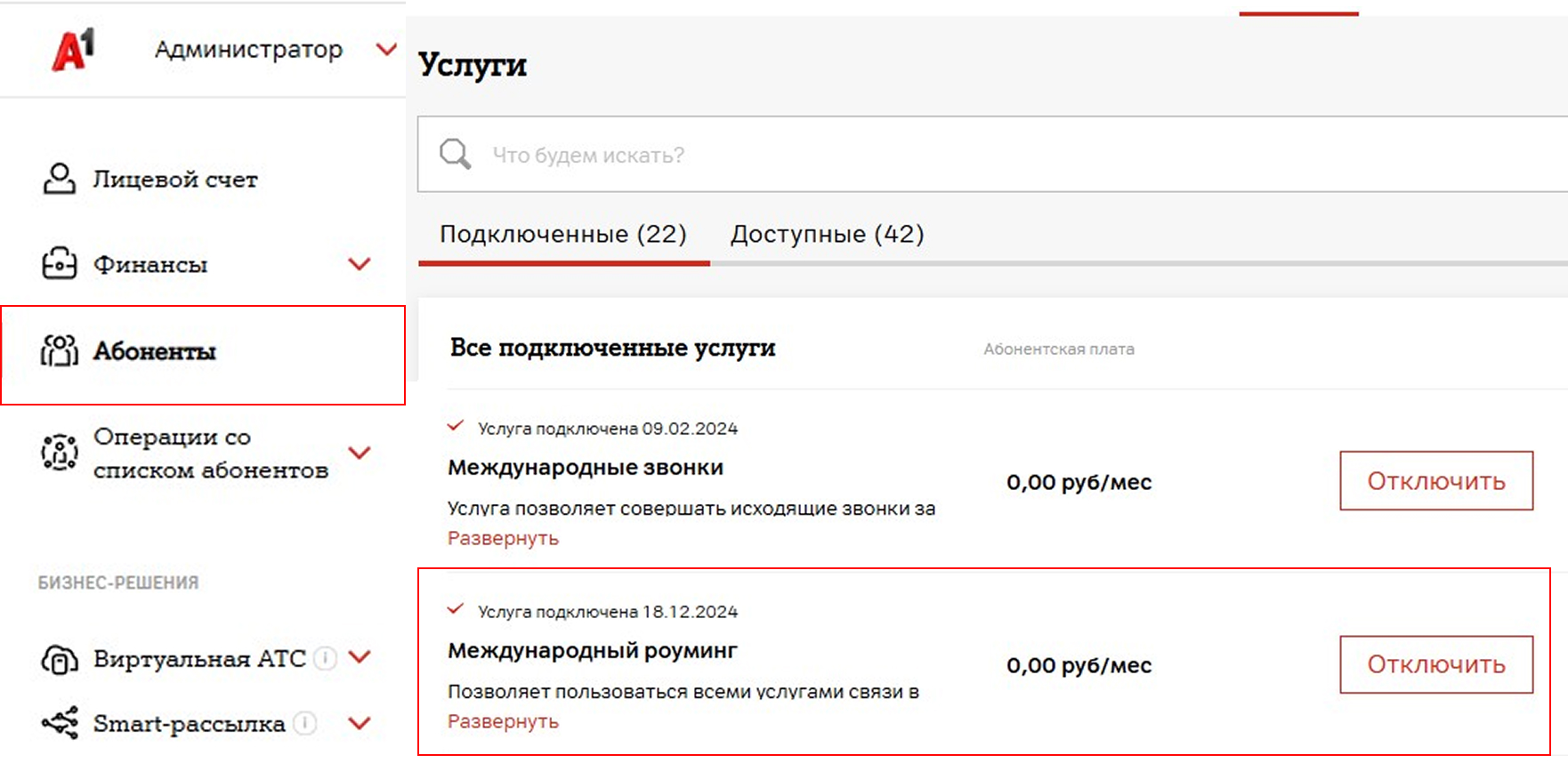 Войдите в Личный кабинет (роль Администратор). У абонента должны быть активны услуги: Роуминг и Международные звонки.Для роли Администратор нужно выбрать Абонента, перейти в раздел Операции с услугами – Услуги абонента: