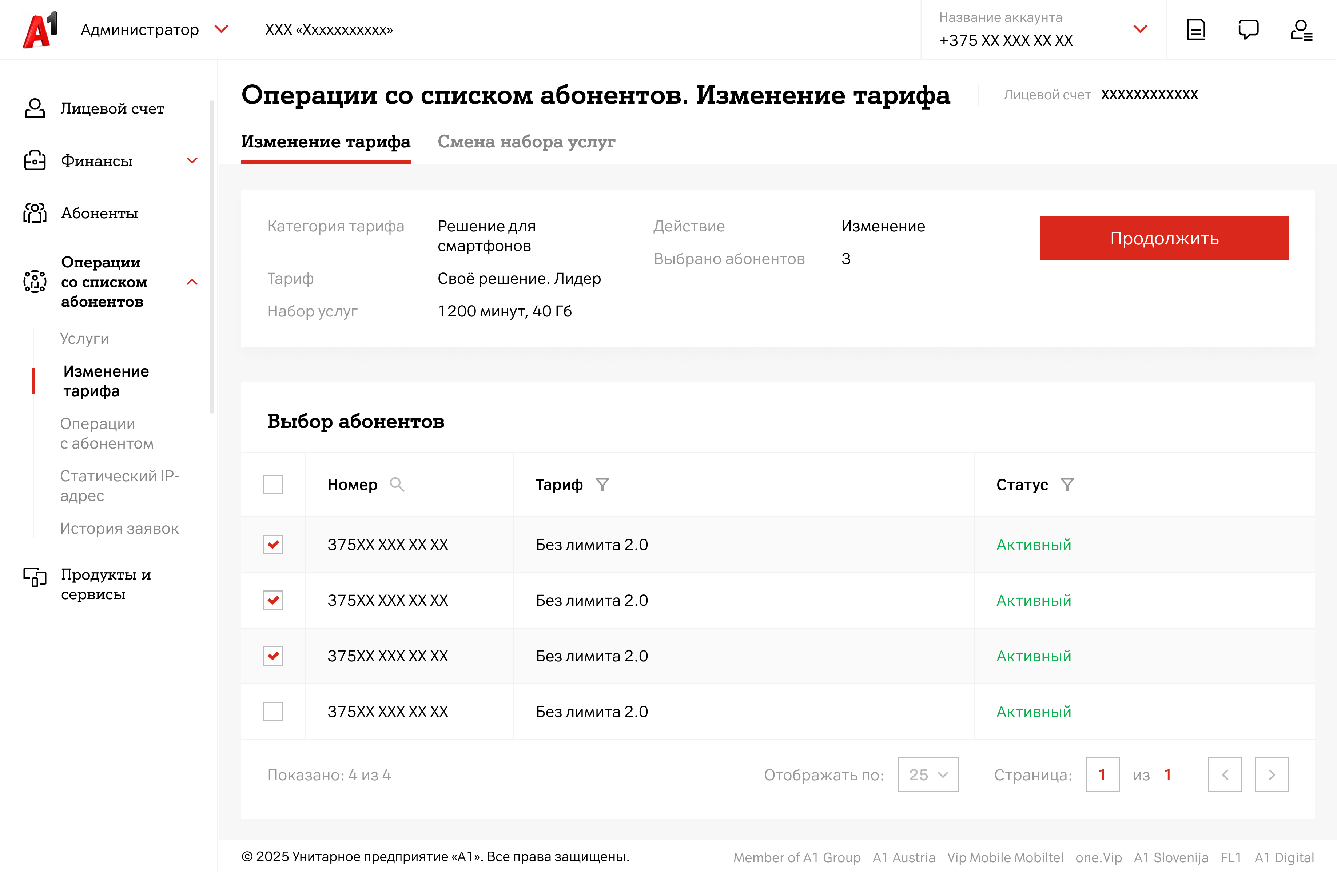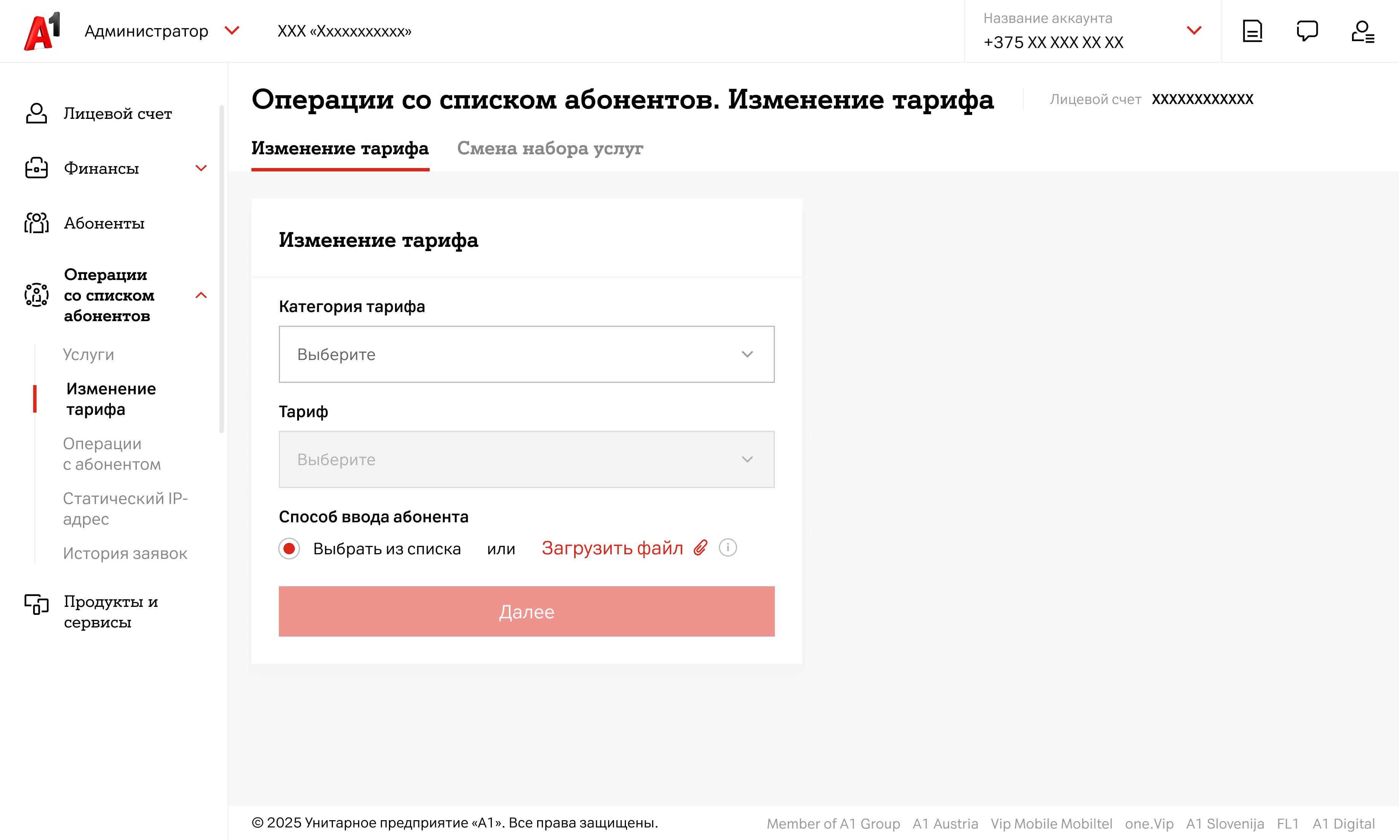 Для изменения тарифа списку абонентов:- В левом меню в блоке «Операции со списком абонентов» выберите раздел«Изменение тарифа»
