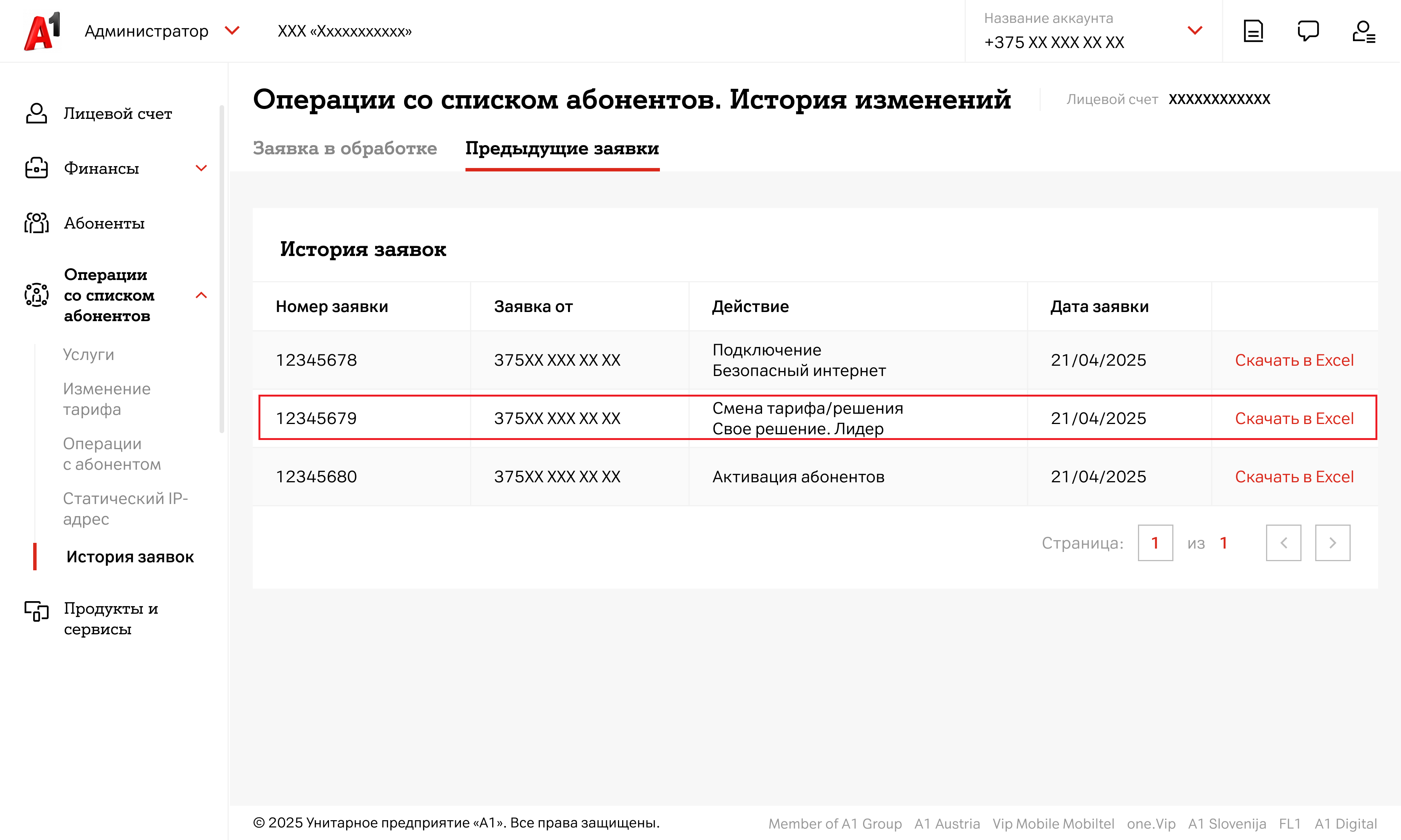 - Выберите абонентов из списка или загрузите файл в формате xlsx (загружаемый файл должен содержать только 12-значные номера абонентов в столбик)