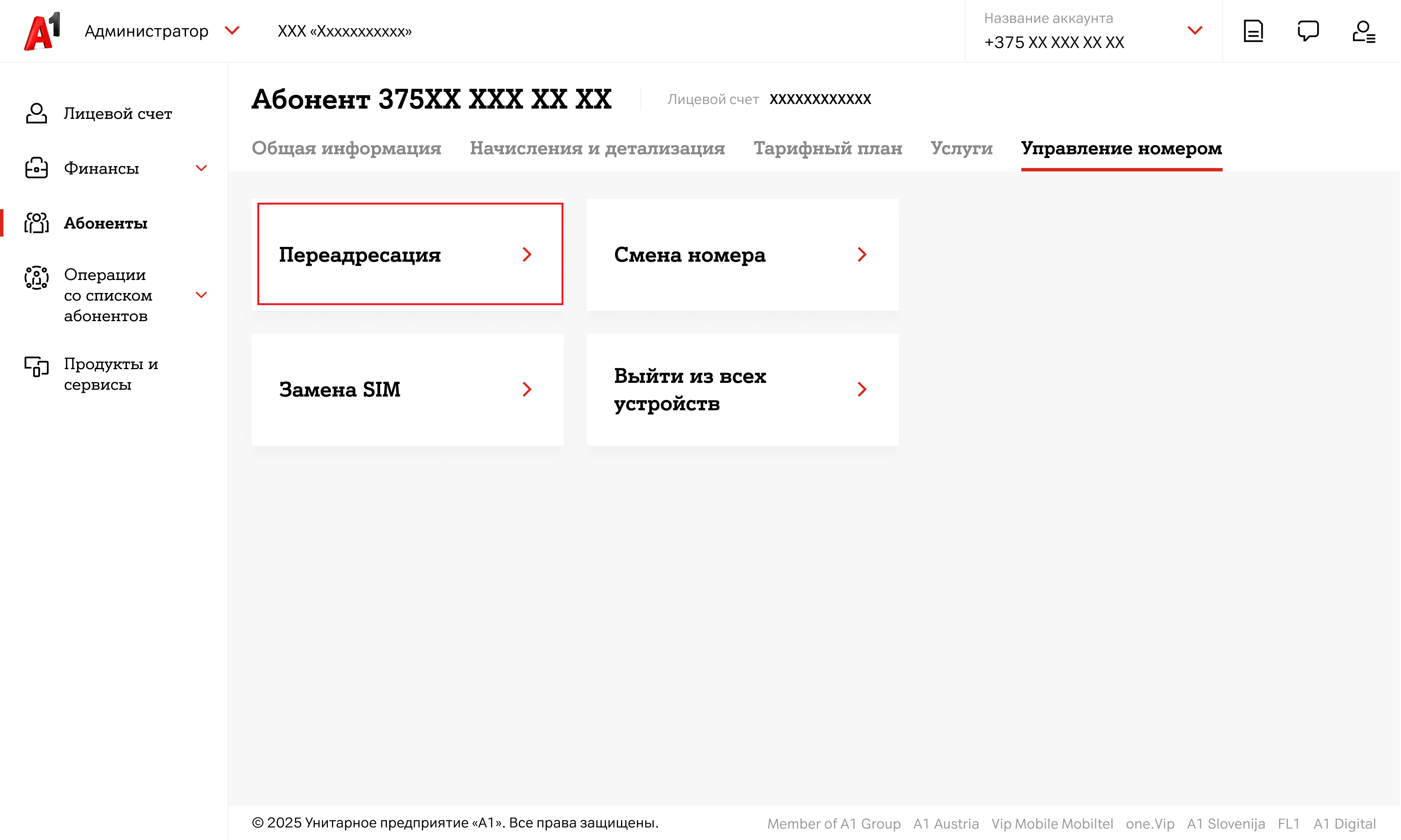 - В карточке абонента выберите блок «Управление номером»