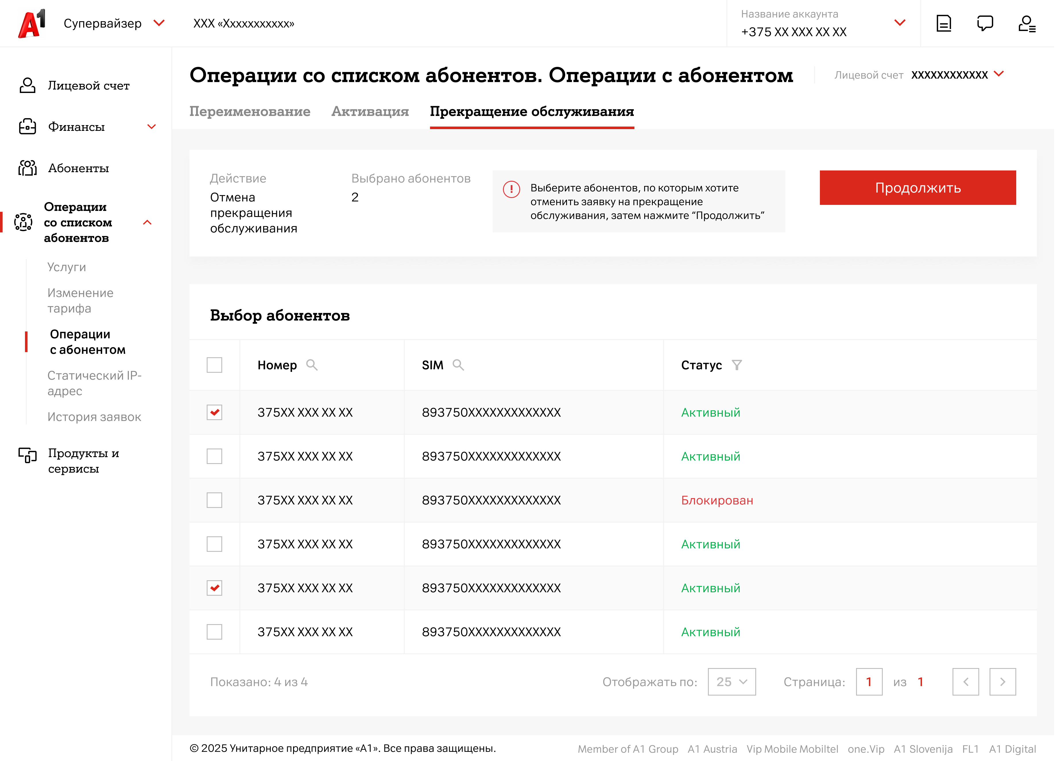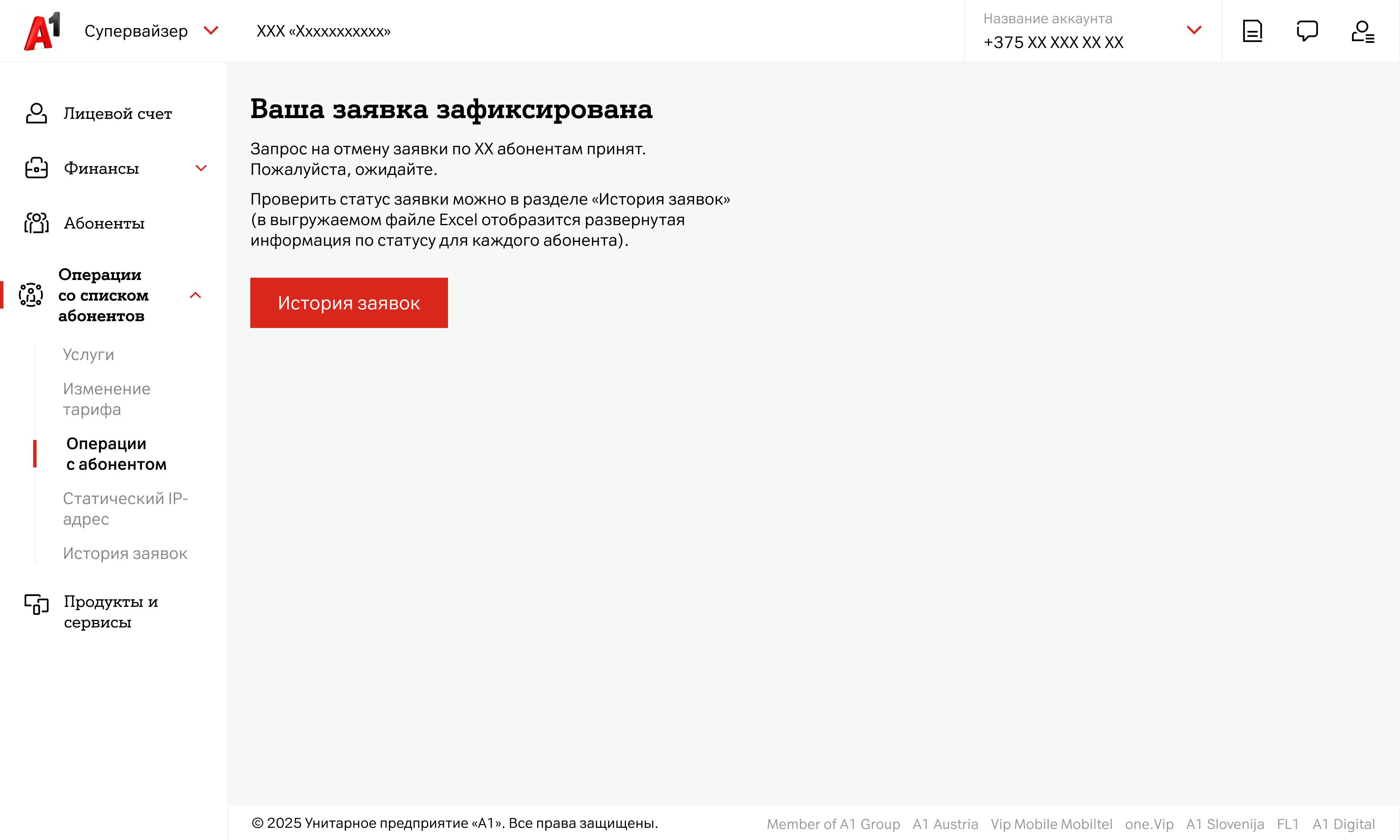 Для отмены заявки на прекращение обслуживания по абонентам:- В левом меню в блоке «Операции со списком абонентов» выберите раздел «Операции с абонентом»