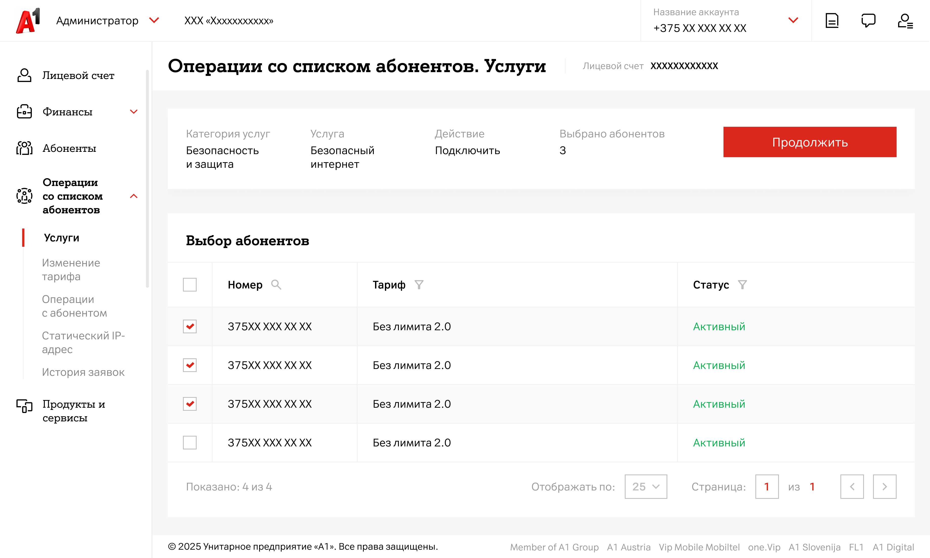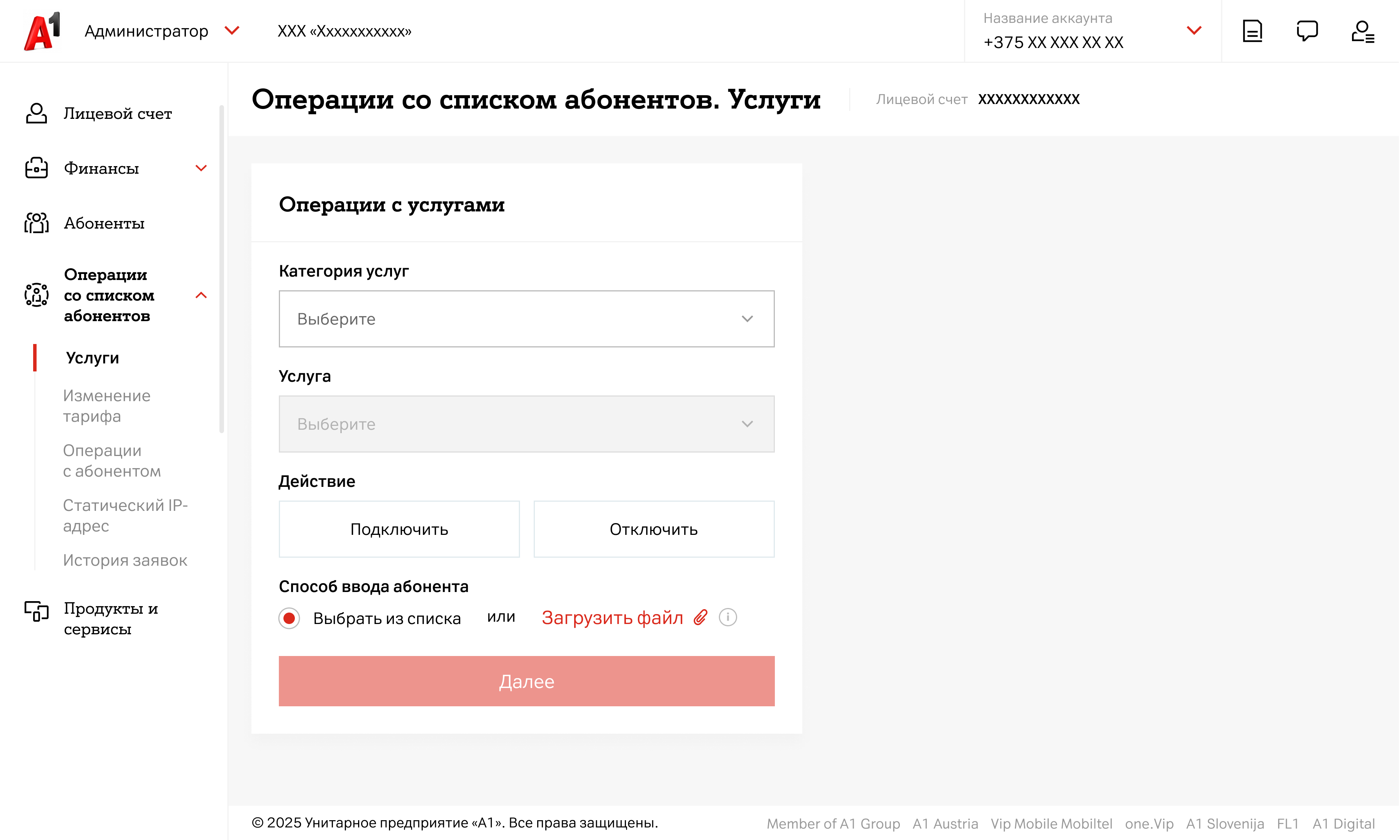 Для подключения/отключения услуг списку абонентов:- В левом меню в блоке «Операции со списком абонентов» выберите раздел «Услуги»