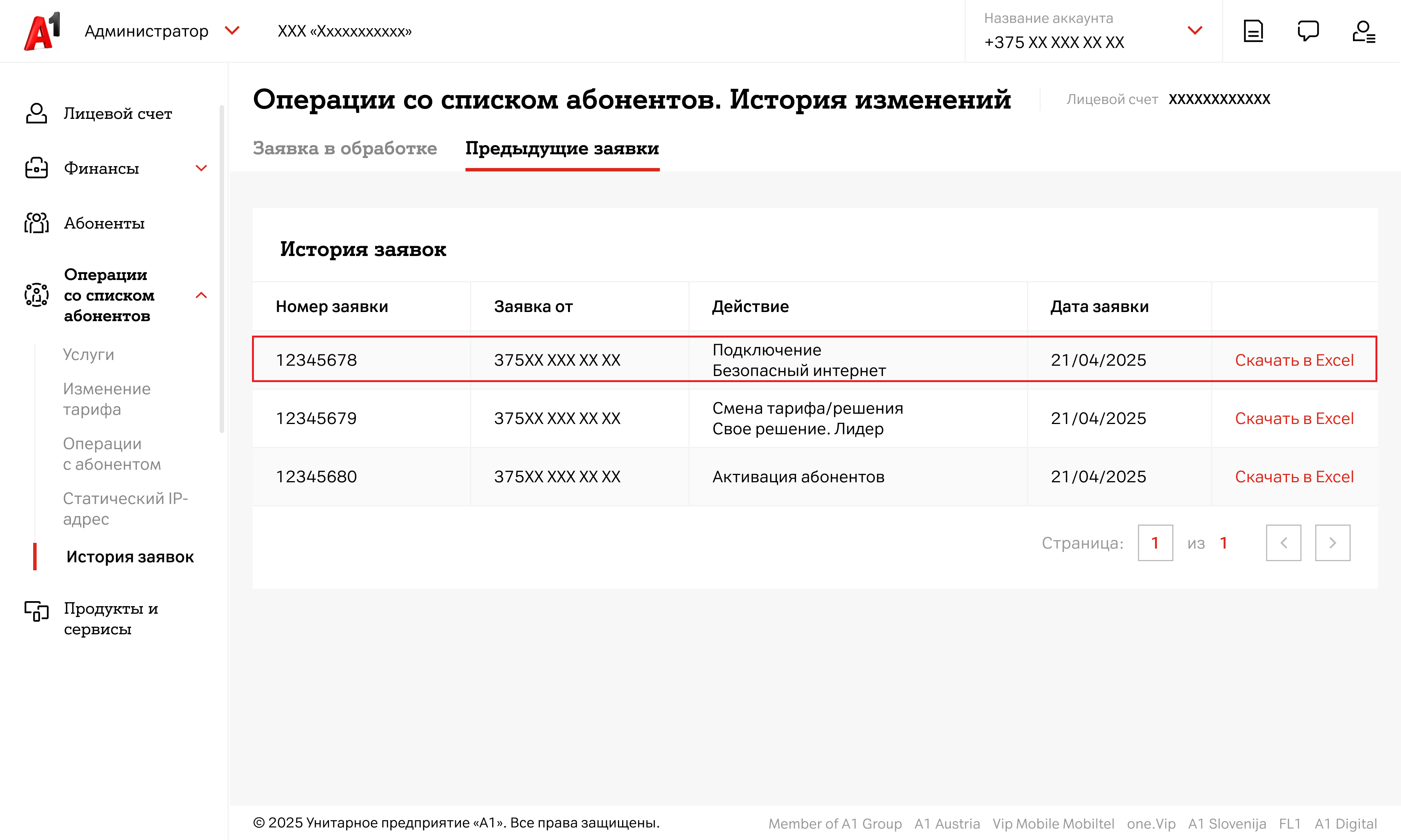 - Выберите абонентов из списка или загрузите файл в формате xlsx (загружаемый файл должен содержать только 12-значные номера абонентов в столбик)