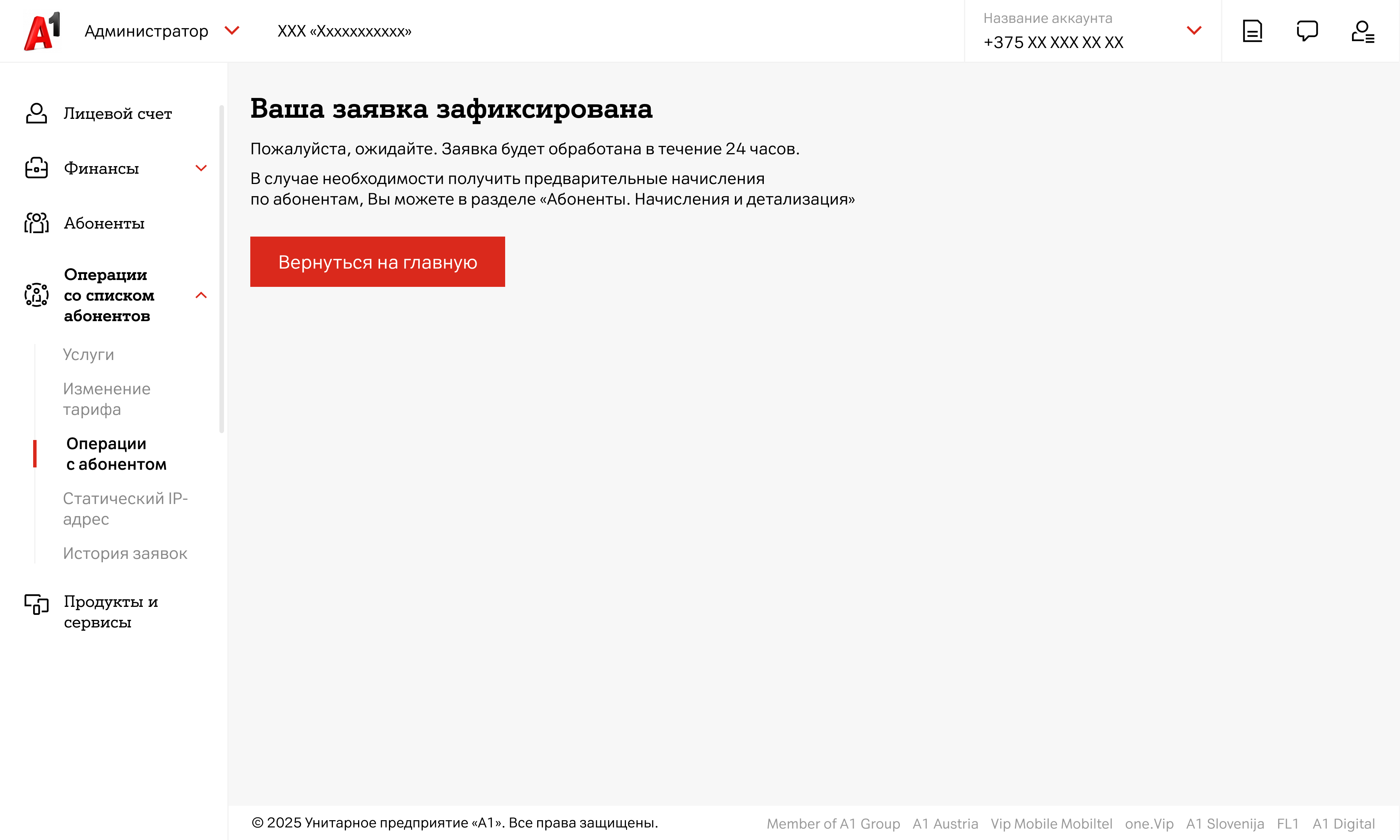Для прекращения обслуживания по одному либо нескольким абонентам:- В левом меню в блоке «Операции со списком абонентов» выберите раздел «Операции с абонентом»