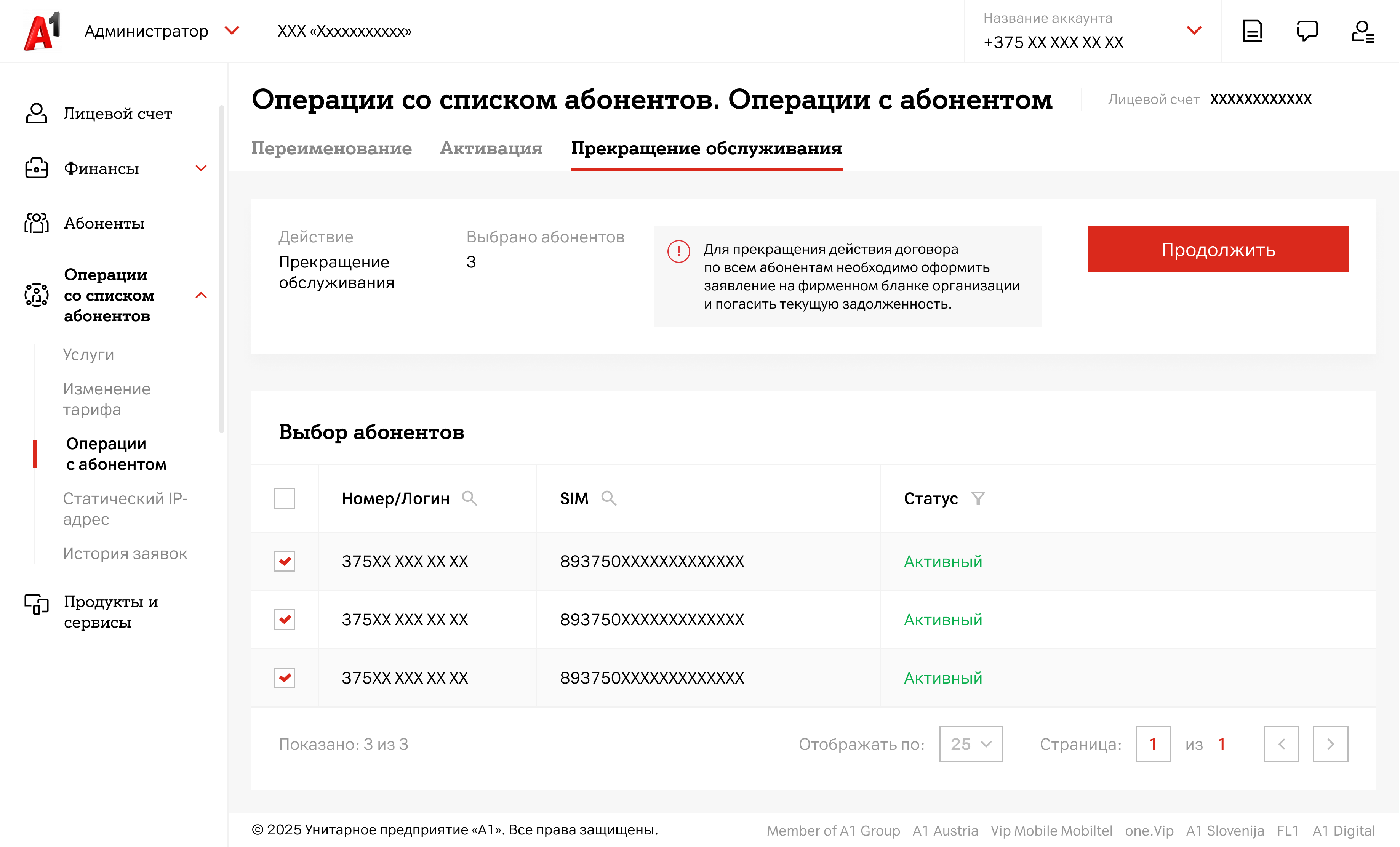- Во вкладке «Прекращение обслуживания» выберите абонентов, по которым вы хотите прекратить обслуживание