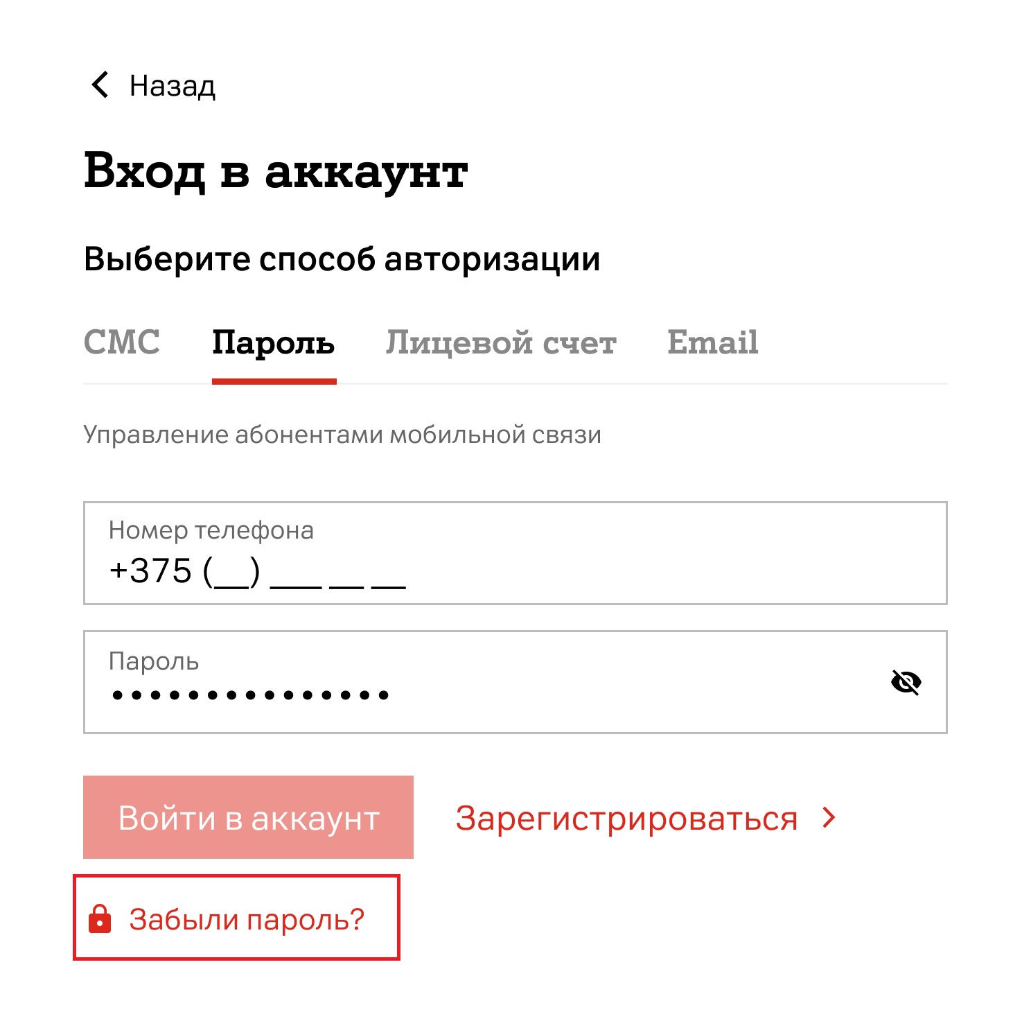 Восстановите пароль через поле «Забыли пароль?»:- Выберите способ авторизации: пароль, лицевой счет