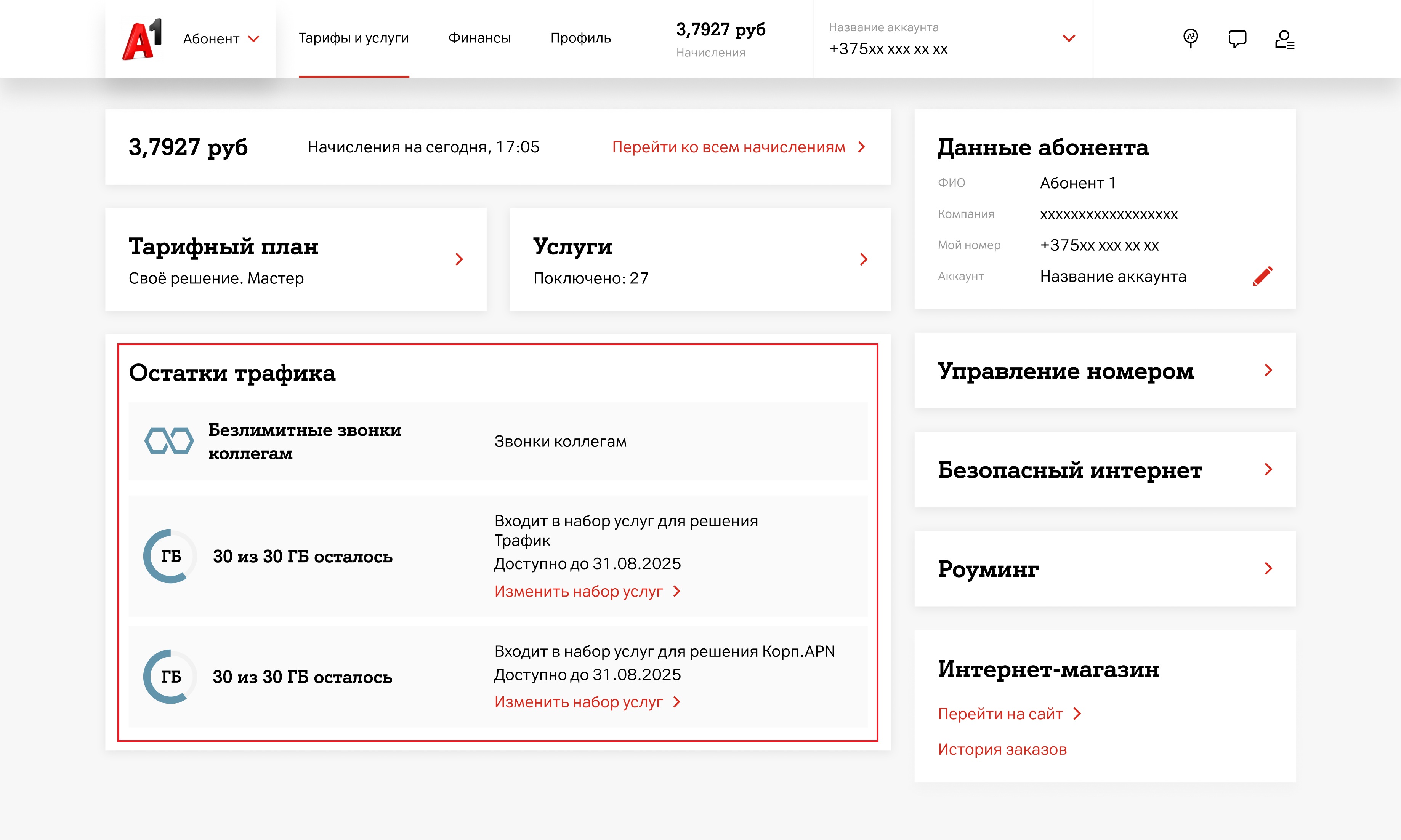 Остатки трафика отображаются на главной странице в карточке абонента