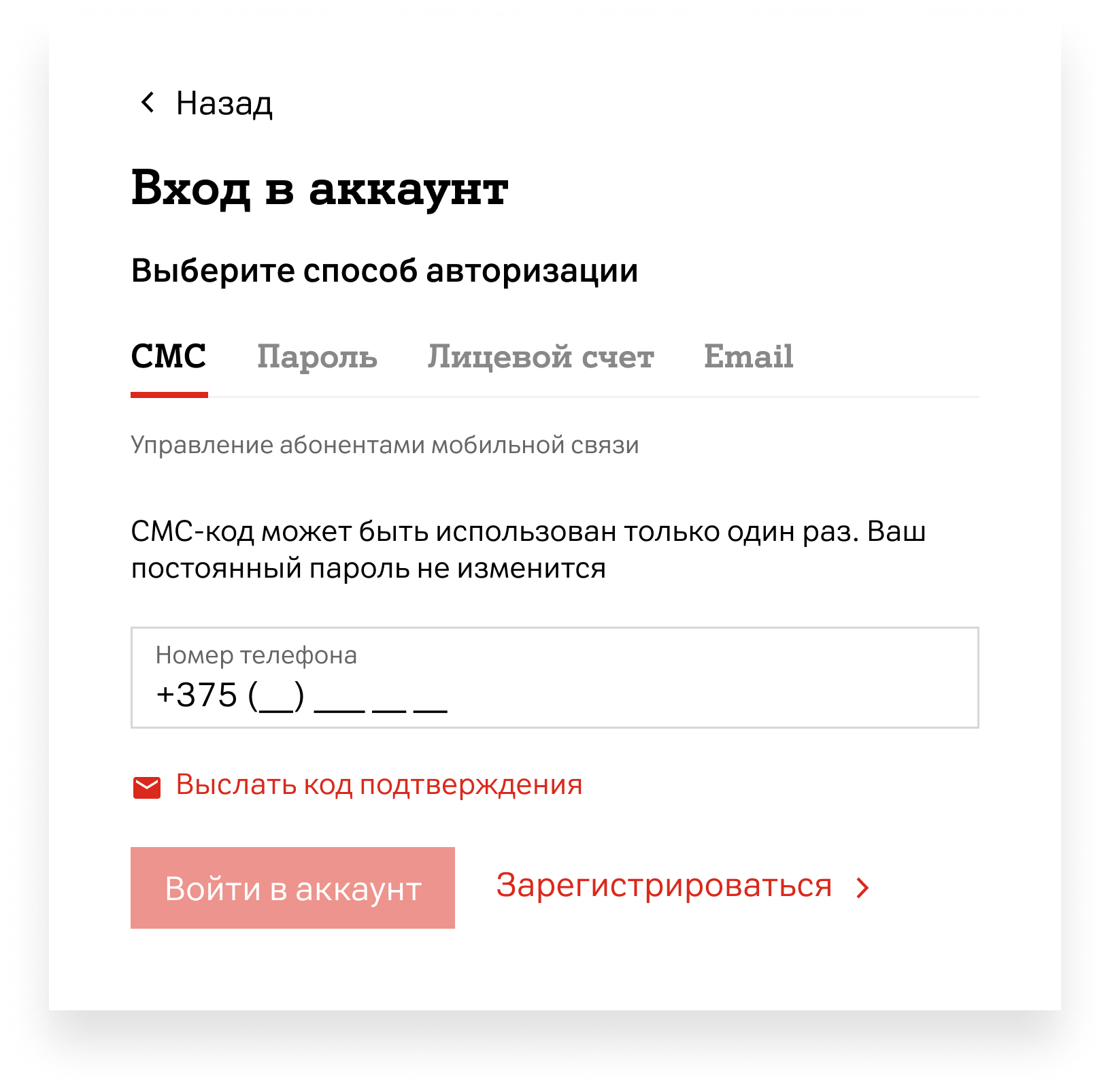 - Выберите способ авторизации: по СМС, паролю, лицевому счету