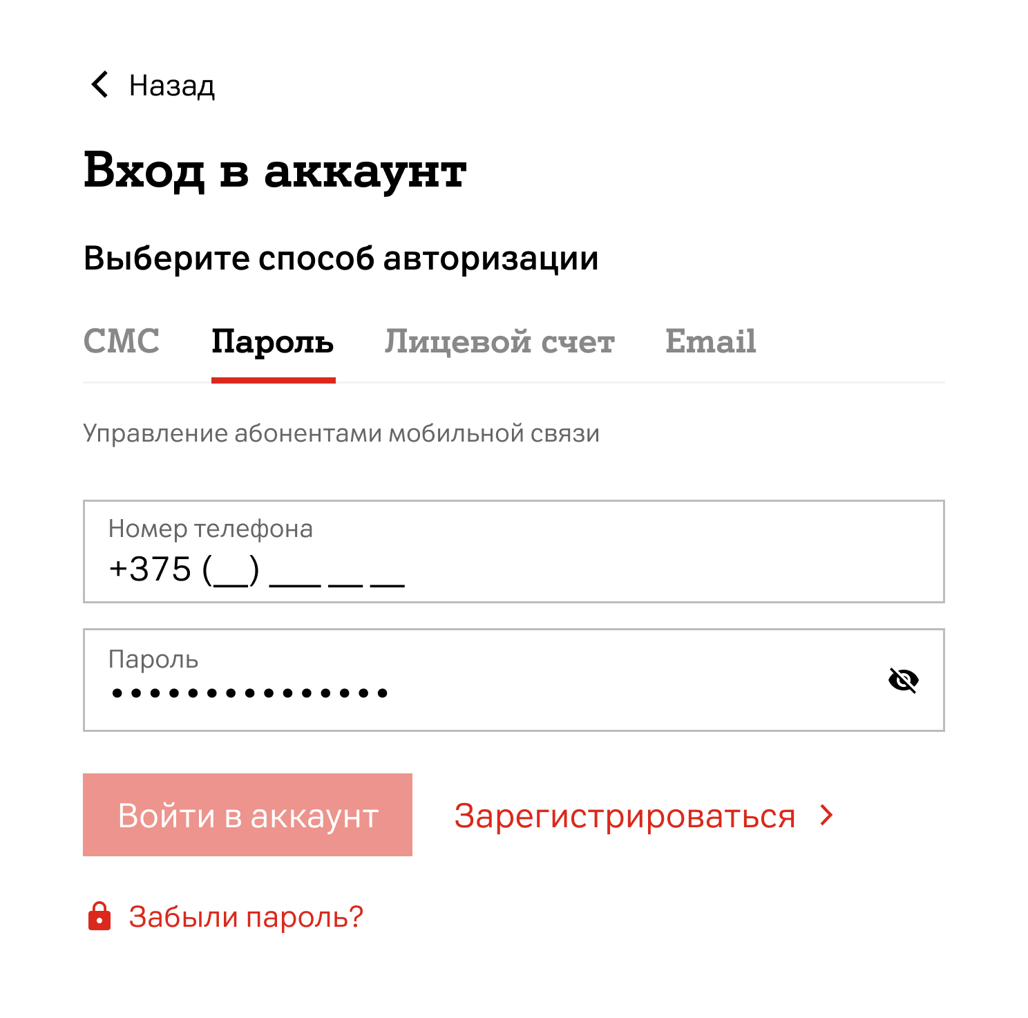 - Выберите способ авторизации: по СМС, паролю, лицевому счету