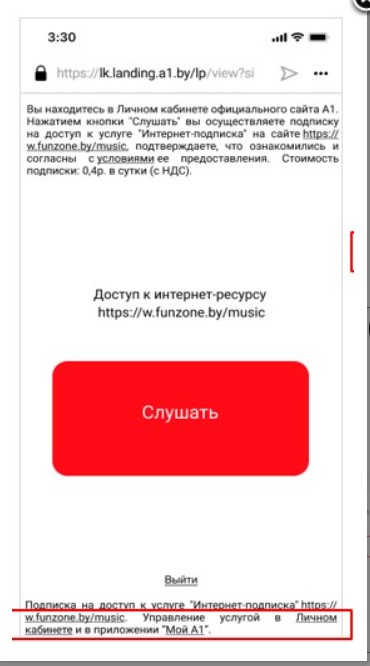 Подключение некоторых услуг (интернет-подписок) вы осуществляете только путем совершения конклюдентных действий на странице Личного кабинета А1 lk.landing.a1.by, путем проставления «галочки» в чек-боксе и нажатия кнопки «Подключить» / «Подписаться»/«Начать» и др. после перехода на нее по клику на рекламный баннер того или иного посещенного ресурса. Страница Личного кабинета А1 lk.landing.a1.by содержит информацию о: название услуги, её стоимость, способы управления подпиской.